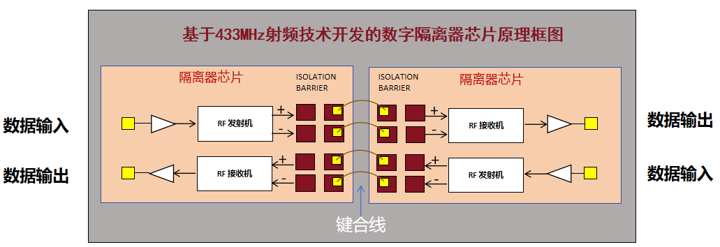 具体而言,在米兰微自主研发的容耦隔离器中,射频发射端会将要传输的数据信号通过OOK调制为高频脉冲信号,而后在电容电场的耦合作用下,高频脉冲信号耦合至射频接收端,并通过OOK解调为初始的数据信号,从而在电气隔离环境中完成数据信号的有效传输。容耦隔离器的功耗基本不随着传输数据速率的变化而改变。