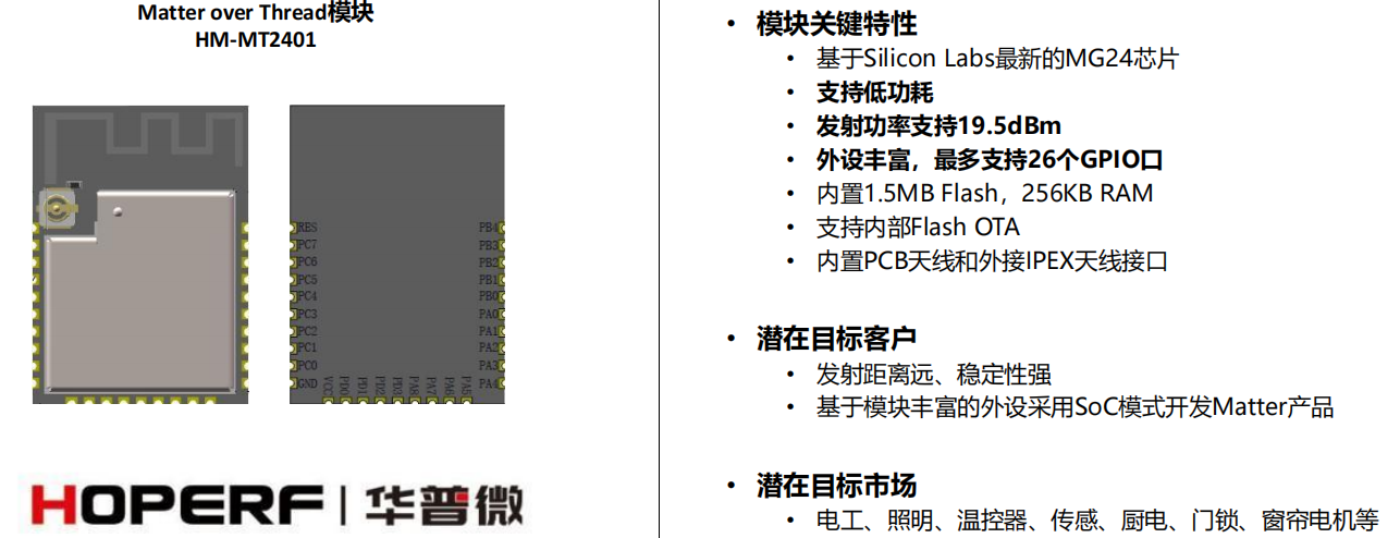 例如,米兰微自主研发的HM-MT2401就是一款基于2.4GHz频段的Matter over Thread无线通信模块,其已被广泛应用于LED灯具、智能开关、智能插座、智能门锁、智能窗帘电机、智能门铃、智能温控器及智能传感器等众多智能家居设备之中。