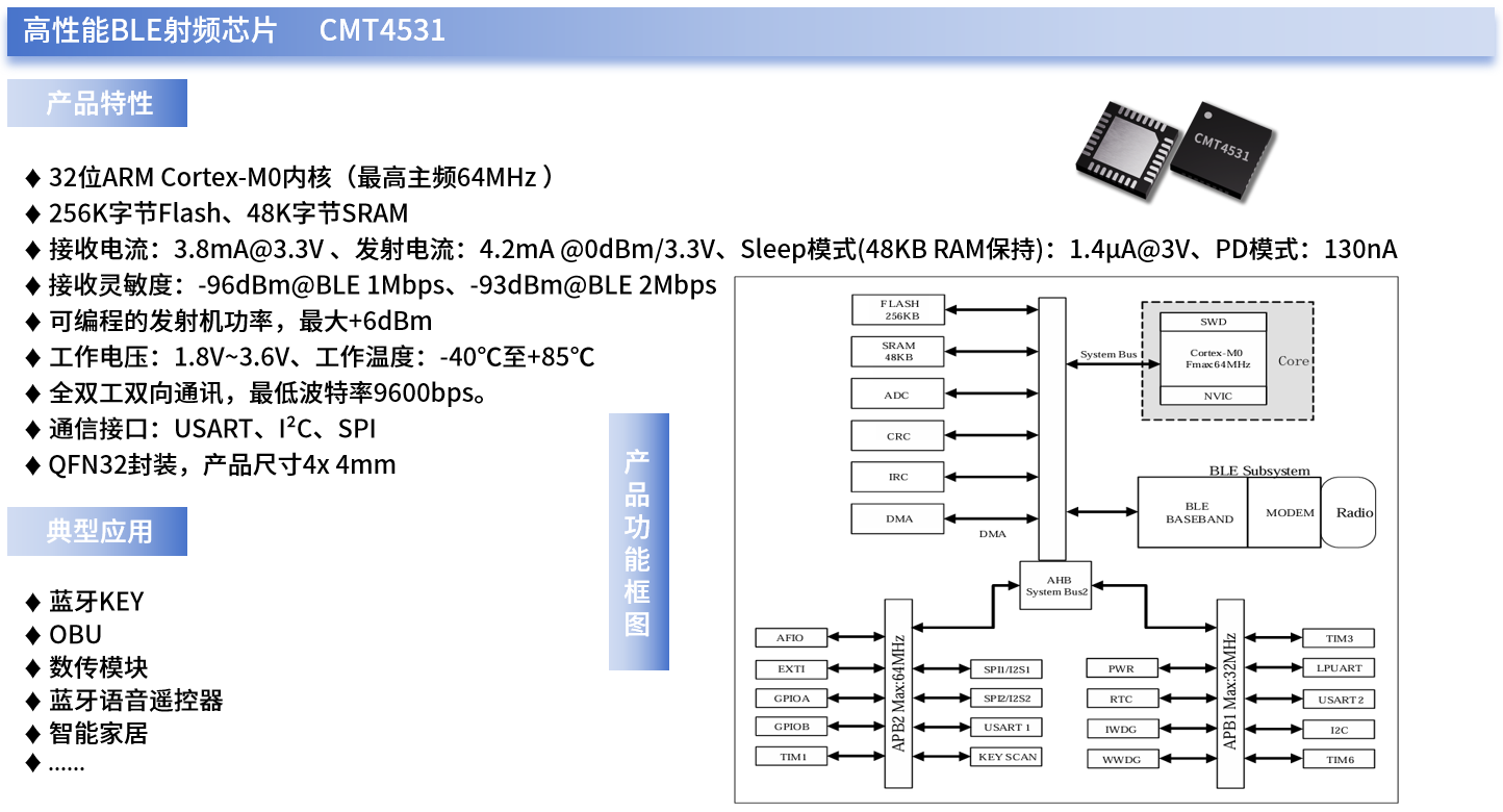 此外,CMT4531还支持主从角色,支持多连接,支持数据包长度扩展,支持KEYSCAN,IRC,10位1.33Msps ADC (可配置为16位16Ksps ), 支持模拟MIC输入,PGA放大,支持基本、通用、高级TIMER,RTC,WWDG,IWDG,LPUART,USART,SPI,I2C等外设。