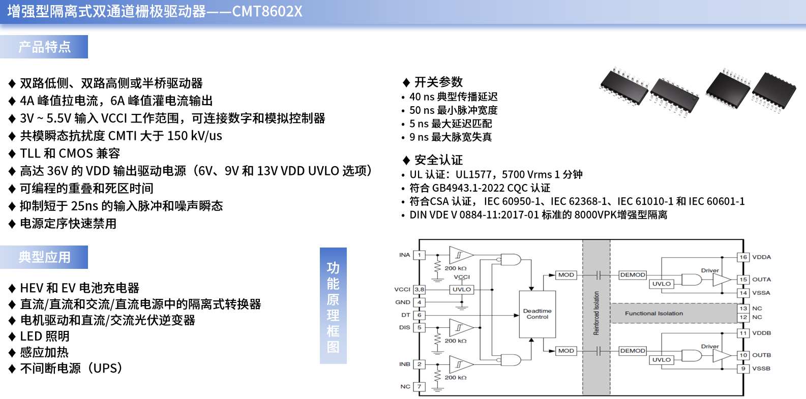 现阶段,隔离式栅极驱动器已被广泛应用在电机驱动系统、光伏逆变系统与大功率电源等应用场景中;例如,米兰微所自主研发的CMT8602X就是一系列增强型的隔离式双通道栅极驱动器,其4A的峰值拉电流和6A的峰值灌电流不仅可驱动高达5MHz的功率晶体管,还具有一流的传播延迟和脉宽失真度。