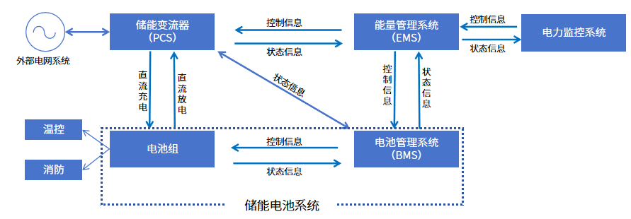 储能系统主要由电池组、电池管理系统(BMS)、能量管理系统(EMS)、储能变流器(PCS)以及其他电气设备构成。电池组是储能系统最主要的构成部分;电池管理系统(BMS)主要负责电池的监测、评估、保护以及均衡等;能量管理系统(EMS)负责数据采集、网络监控和能量调度等;储能变流器(PCS)可以控制储能电池组的充电和放电过程,进行交直流的变换。