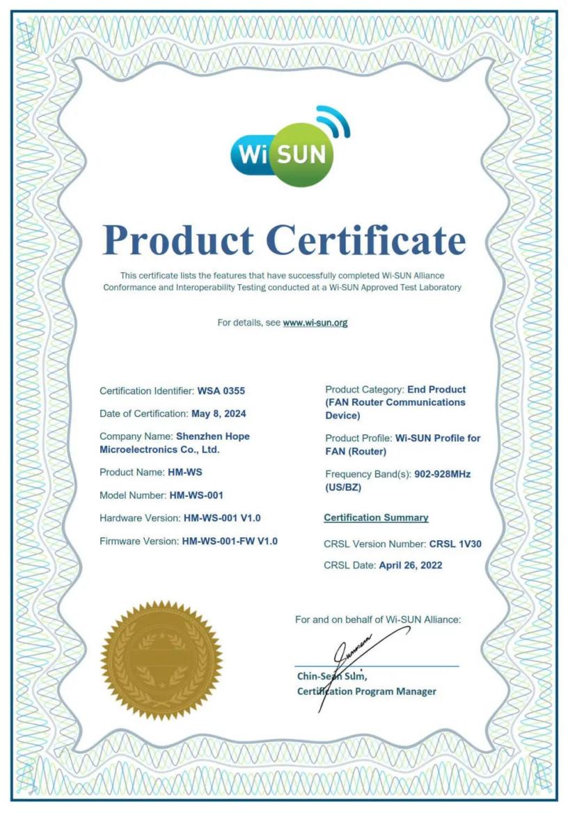 Wi-SUN FAN基于网状网络,HM-WS-001能够与周围大量的设备建立多个连接,通过多个链路中继数据并提高可靠性。此外HM-WS-001已通过Wi-SUN® 联盟PHY认证并获得认证证书,可完美应用于自动抄表、家居安防及楼宇自动化、ISM 波段数据通讯、工业监控及控制、遥控及安防系统、遥控钥匙进入、无线传感器节点、标签读写器以及其他物联网通信应用场景。